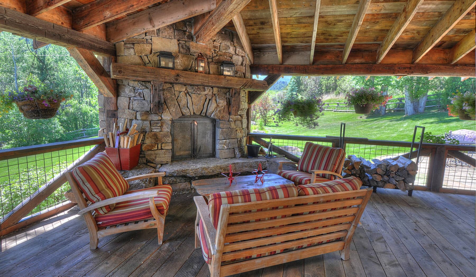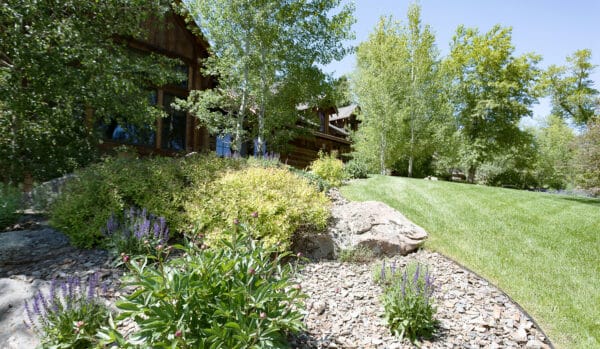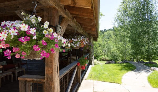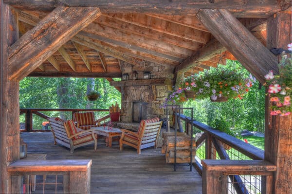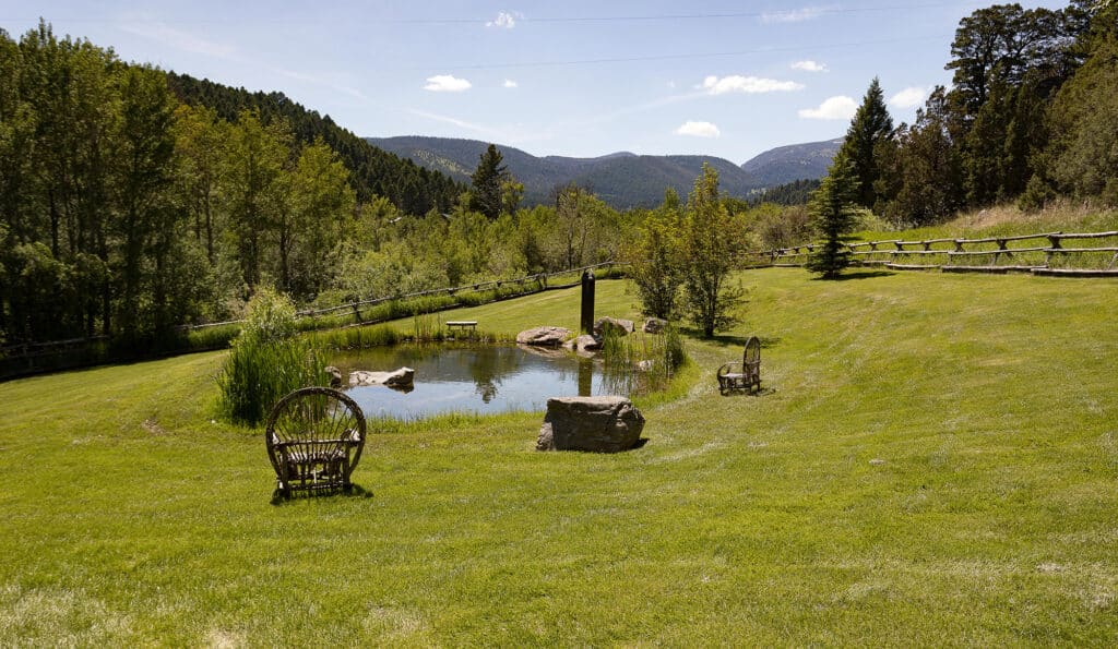 The flagstone patio, which is beautifully landscaped with boulders, perennial flowers, and flowering trees, flows naturally onto the lawn leading to a small pond. The patio transitions onto the covered porch that provides an exceptional three-season environment and has a ranch-style table for eight with additional seating areas to host larger crowds comfortably. The covered deck includes a wood-burning fireplace with a stone hearth to take the edge off the temperate Montana evenings that couple with Meadow Creek tumbling below to create an outdoor ambiance and setting that is unrivaled.