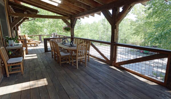 Behind the entry art wall is access to the great room, kitchen, or dining room area. The great room features a stunning dry-stack stone fireplace with custom-forged iron doors and a massive stone hearth and mantle. The vaulted ceiling, which features timber-frame elements using recycled timbers, allows for expansive windows that open up to the views to the east that include Ennis Lake, and Fan, Lone, and Sphinx Mountains in the Madison Range. There are also built-in bookshelves that include a rolling ladder for access to the upper levels. The well-thought-out floor plan includes sliding doors that allow smooth traffic flow onto the deck for ease of use. The dining area nicely fits a round table that seats eight. This space is built for entertaining and includes a built-in wine rack and art cubbyhole with accent lighting. The gourmet kitchen with soapstone counters features an island with a six-burner gas cooktop and a custom-forged copper vent hood. Two sinks on either side of the kitchen help disperse the prep work. There is a Subzero fridge/freezer, double Capital ovens, and a built-in Sharp microwave. The kitchen houses a Ranch Eyes video system that has four cameras that provide video surveillance of the naturally secure and safe property. And the Generic whole-house generator provides peace of mind.