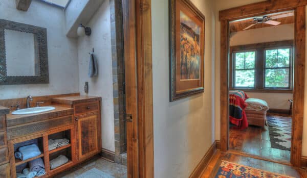 The master bedroom is located perfectly in a quiet corner of the house so that the large east-facing windows can gather the morning light rising over the Madison Range and Ennis Lake. The master bathroom includes double sinks, a soaking tub, and a fully-tiled steam shower with a glass euro door. The master closet has built-in shelves and hanging rails for his-and-her clothing and storage.