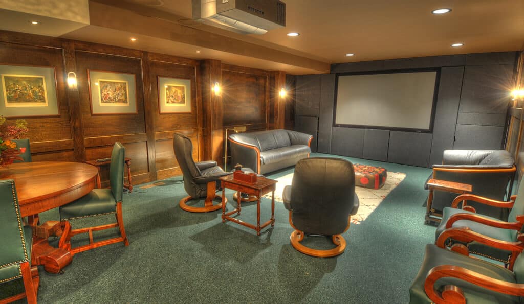 The lower level of the home is set up as a center for recreation with a piano, pool table, his and hers changing rooms for the pool, and a large home theatre with dark mahogany siding, leather couches, movie chairs and high-end electronics featuring a Runco projection system. The home is equipped with an elevator, that provides access to all three levels of the home for those challenged by stairs, and the ability to move larger items into the expansive lower-level storage rooms.