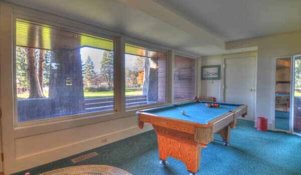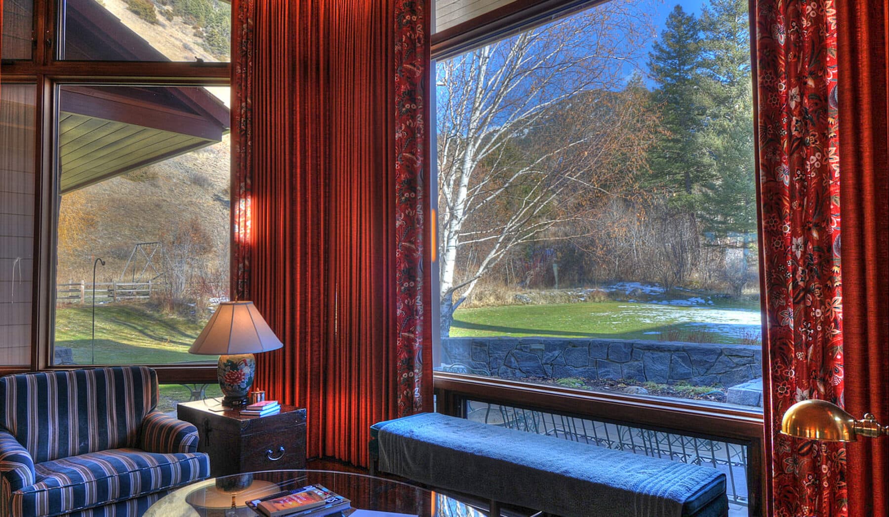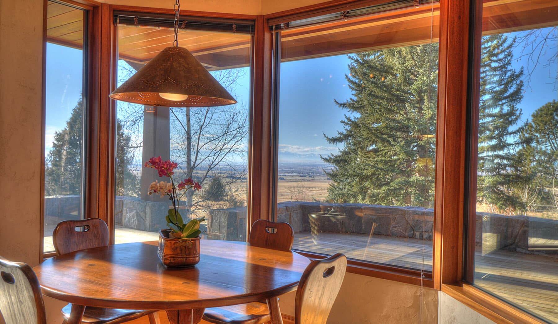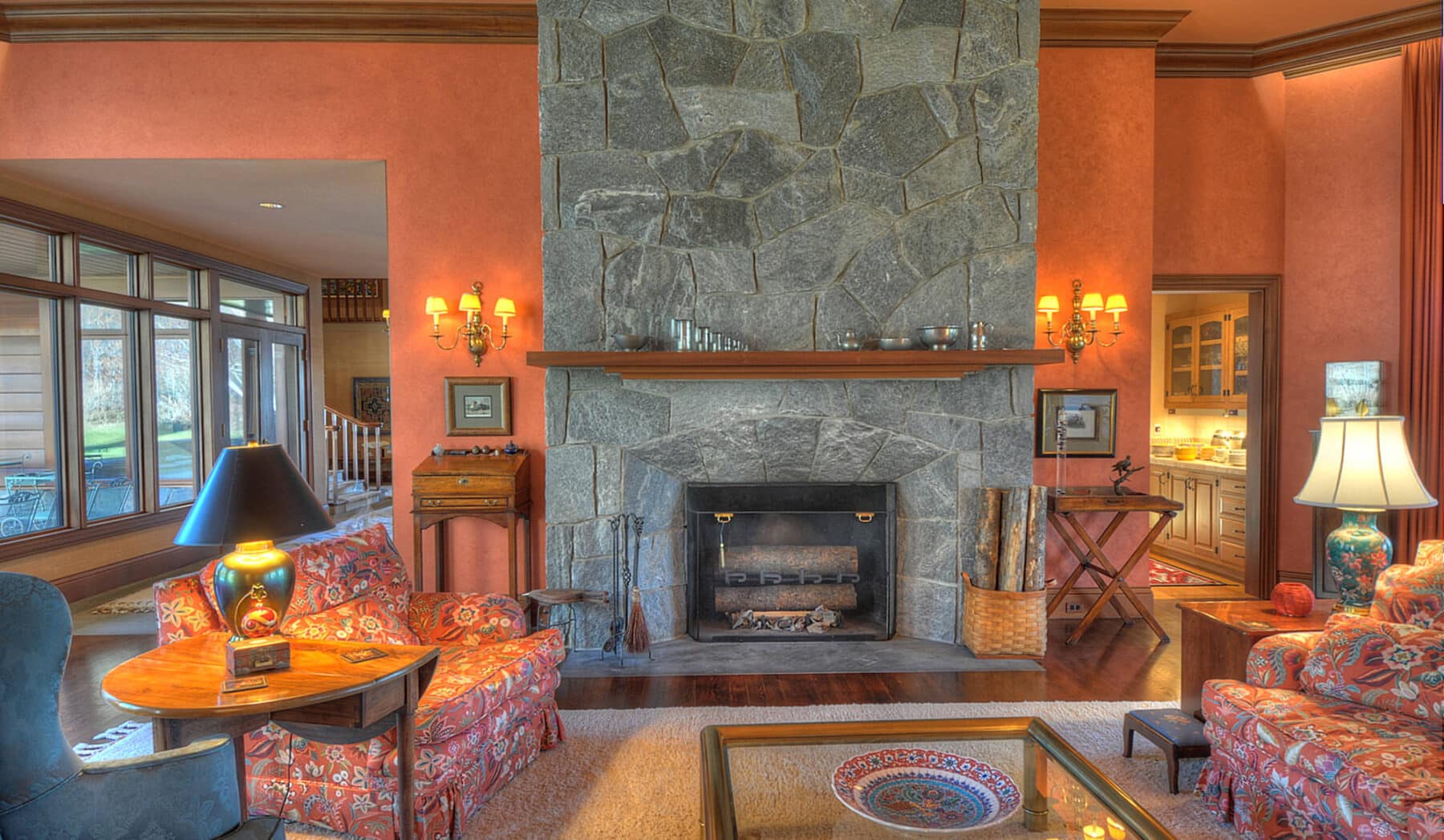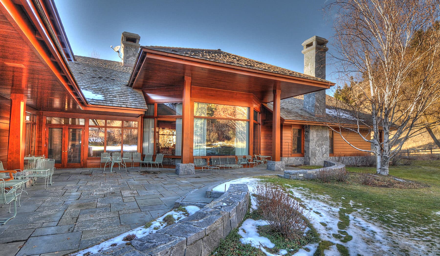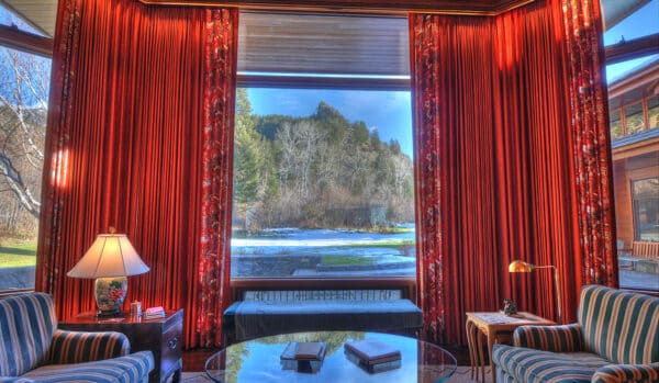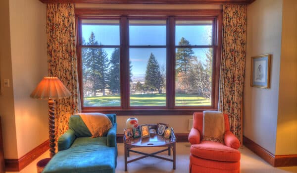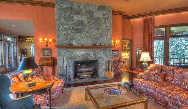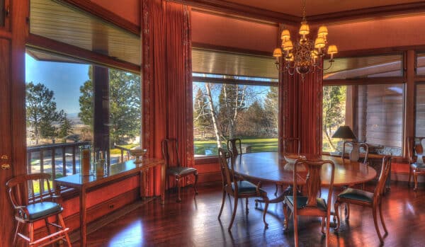 The great room spans the entire length of the home from east to west with massive windows that complement the dramatic 13-foot ceilings and offer expansive views of Bostwick Canyon to the east, and overlook the pool, grounds, and tennis court to the west. At one end of the great room, near the large circular dining-room table, is a large wood-burning fireplace made of Gallatin Canyon Gneiss stone with a stone mantle and a custom fire rack that allows whole logs to be fed on a continuous basis.