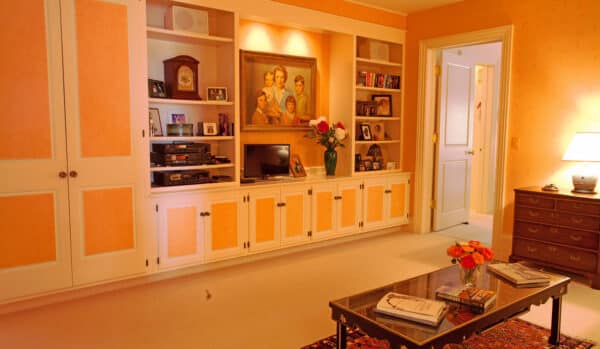 Off the great room, there is a library with built-in bookshelves that wrap around the entire room and a wood-burning fireplace. The library is a private space with great views of the backyard looking towards Bostwick Canyon. The full carpet and double door create a very private and quiet space for work, reading, and TV watching.
