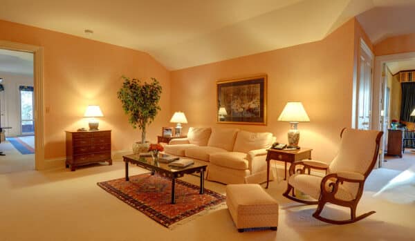 The home has a magnificent foyer with an 18-foot vaulted ceiling, a beautiful brass chandelier, and a wraparound staircase featuring a beautiful custom mahogany handrail that leads to the upper-level guest suites. The banister has provided opportunities for several generations of both the young and the young at heart to slide down.