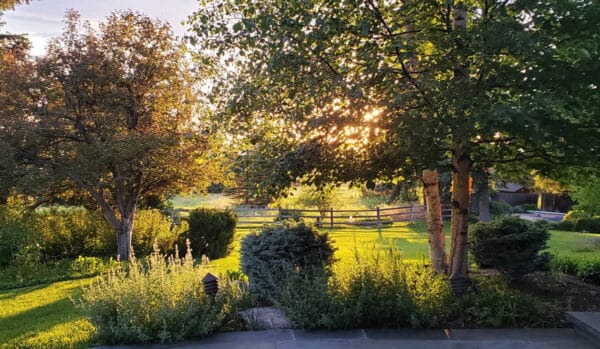 The setting and views from the horse barn are stunning. The panoramic perspective of the Hyalite, Spanish Peaks, and Tobacco Root mountain ranges are framed in the foreground by native junipers and aspen trees as the creek tumbles out of the Gallatin National Forest to the west.