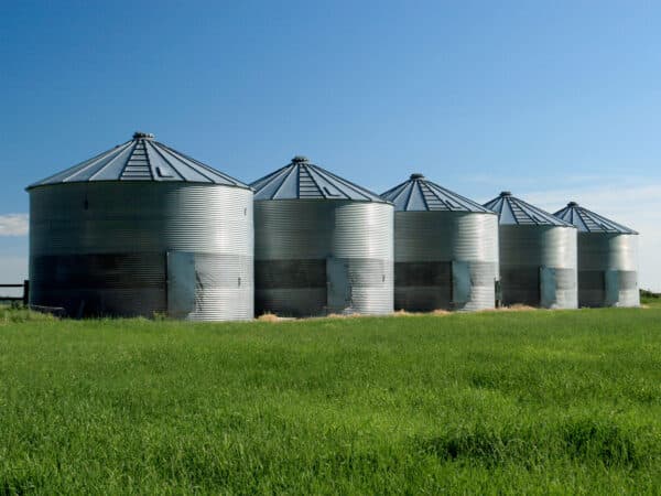 Five – 24′ diameter x 14′ tall steel bins with concrete floors, built-in unloading systems – 6,000-bushel capacity;