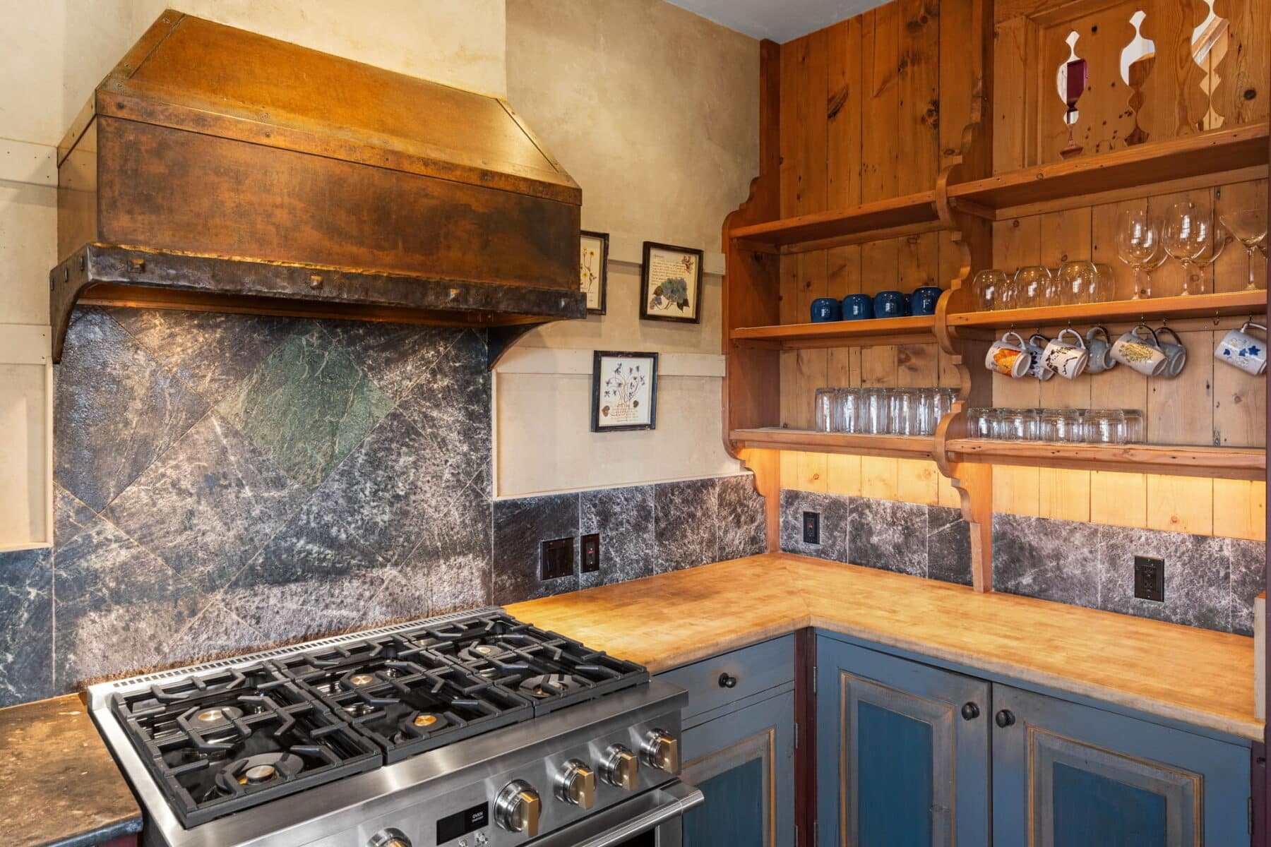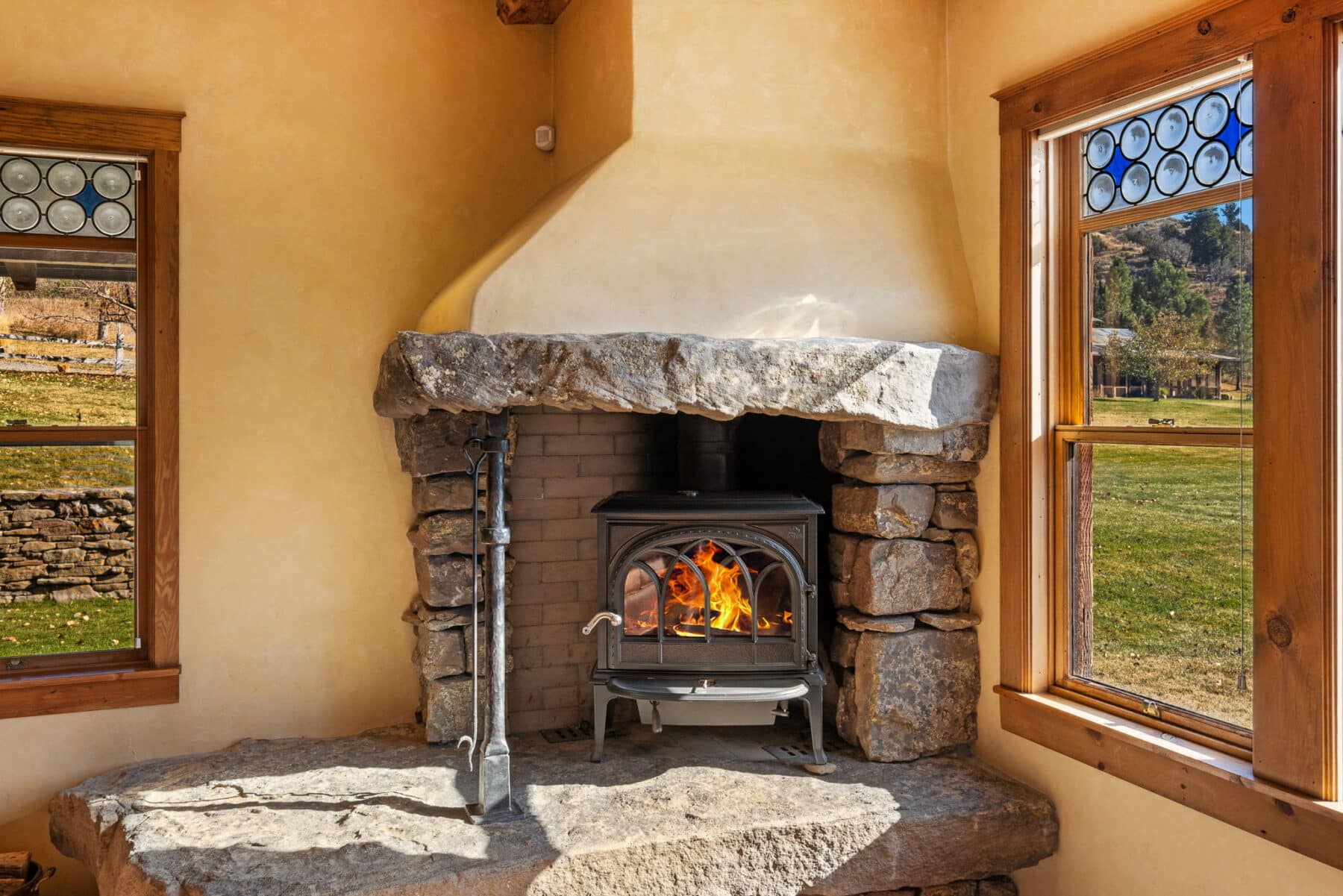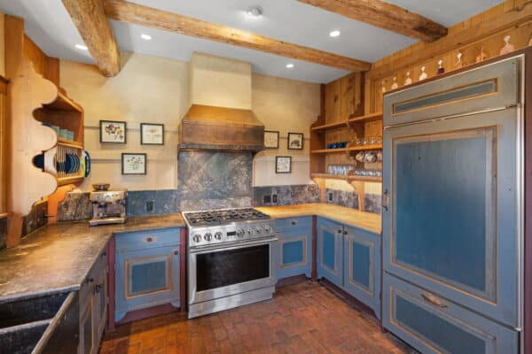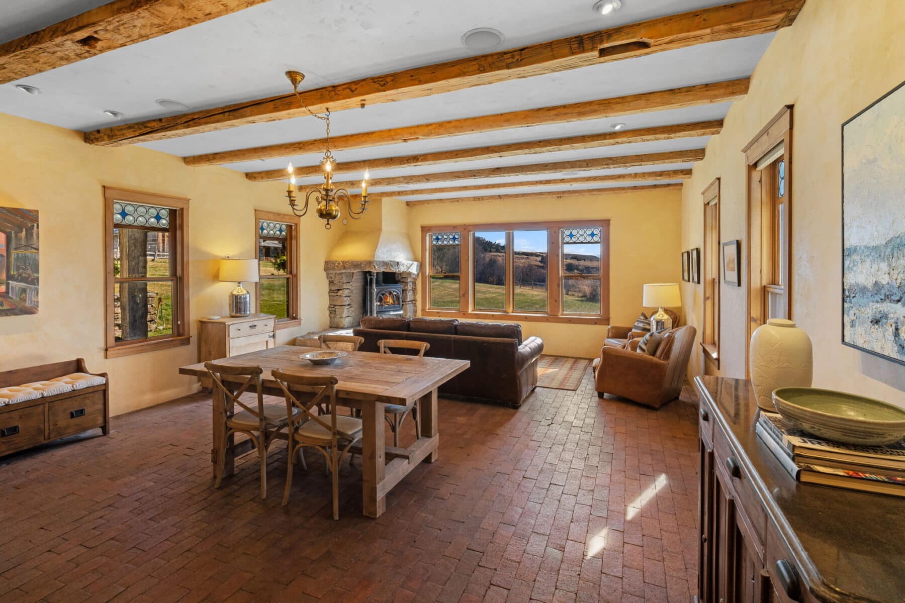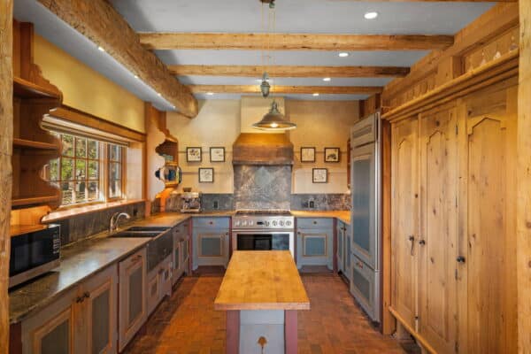 Nestled along the Shields River, this extraordinary 2,226-square-foot residence stands as a masterful blend of historical charm and artistic innovation. Built in 2001 by Yellowstone Traditions under architect Larry Pearson’s vision, the two-bedroom-two-bathroom home showcases reclaimed timber from an 1800s barn, once part of the historic Salisbury Hotel, beautifully complemented by dry-stacked regional moss rock and rusted corrugated metal roofing with copper rain gutters. The artistic owners infused the space with Scandinavian influences, evident in the hand-painted Norwegian blue kitchen cabinetry, custom-crafted staircases, and thoughtful architectural details. The gourmet kitchen features soapstone countertops, a double sink, and high-end appliances, including a Sub-Zero refrigerator and Monogram range. The main floor features a stunning master suite with a spa-like bathroom, complete with a limestone soaking tub, hammered copper double sinks, and a travertine and tumbled marble shower. For easy access to the outdoors, French doors open to a stone patio. The light-filled 690-square-foot upper level, with its own balcony overlooking the river, offers an additional bedroom. Exceptional craftsmanship is displayed throughout, from bold hand-forged metal straps crafted in Red Lodge to old-world Venetian plaster walls and reclaimed fir planking. Modern amenities include radiant in-floor heating, solar panels for domestic water heating, and a Jotul cast iron woodstove set on a massive stone slab. The 1,011-square-foot media room has a large steel door that provides excellent light. If privacy is preferred, the door can be covered with the sliding reclaimed wood door for privacy. The mature landscaping featuring native grass beds transitions seamlessly to the natural river-front setting.