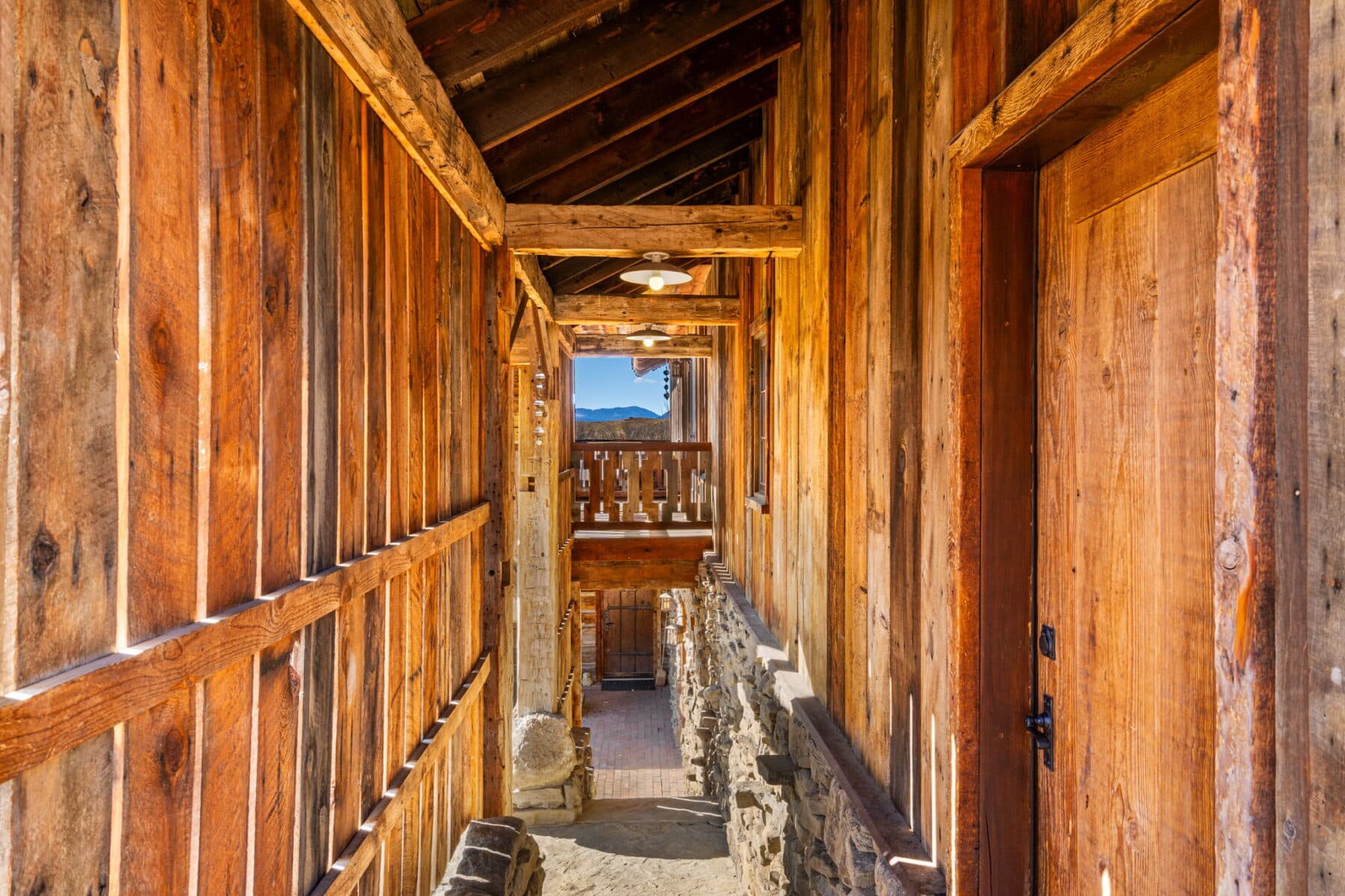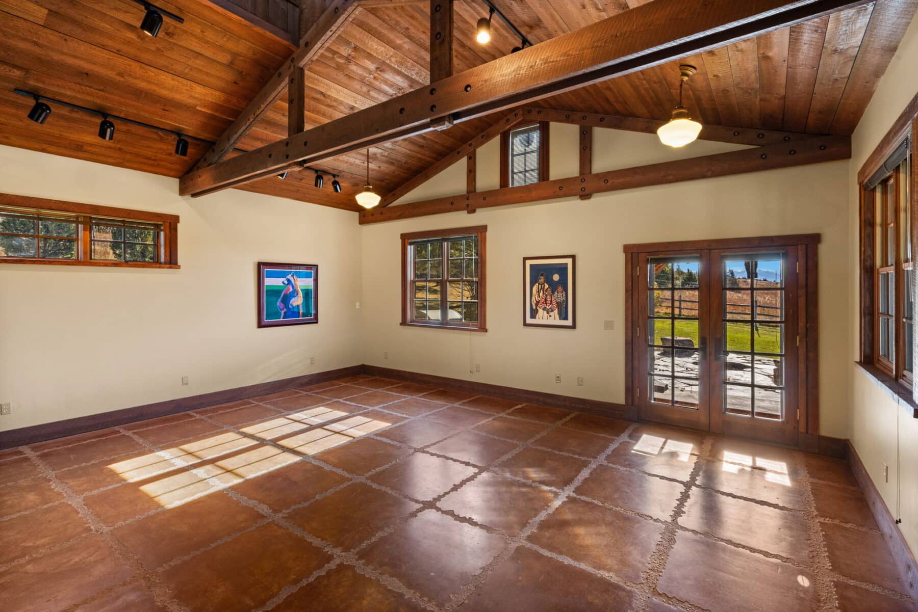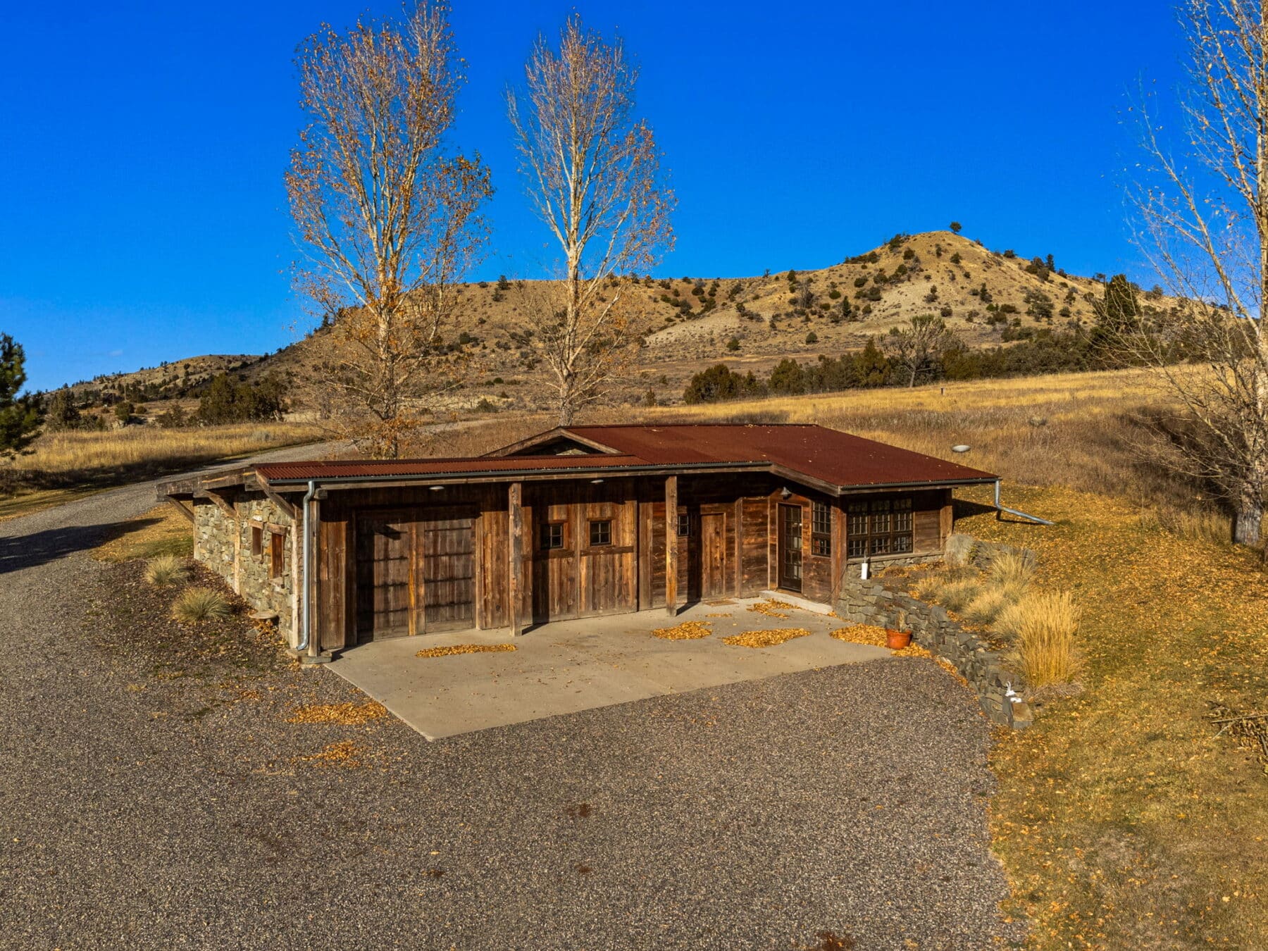 The detached garage, added in 2004, complements the Montana compound with its timeless design that appears to have graced the property for centuries. Spanning 1,496 square feet, this sloped “turn-out shed” style structure features an oversized two-car garage with two manual sliding doors beautifully clad in reclaimed timber and one electric overhead door. The exterior showcases a harmonious blend of dry-stacked regional stone and weathered timbers, while the interior offers practical finishes, including plywood walls and concrete flooring. Beyond its primary function, the building houses dedicated spaces for storage, a wine cellar, and a potting shed. Thoughtful amenities include in-floor radiant heating and abundant wood-clad windows that flood the space with natural light. A custom door provides additional access to the garage, making this outbuilding both functional and architecturally striking.
