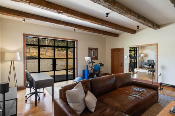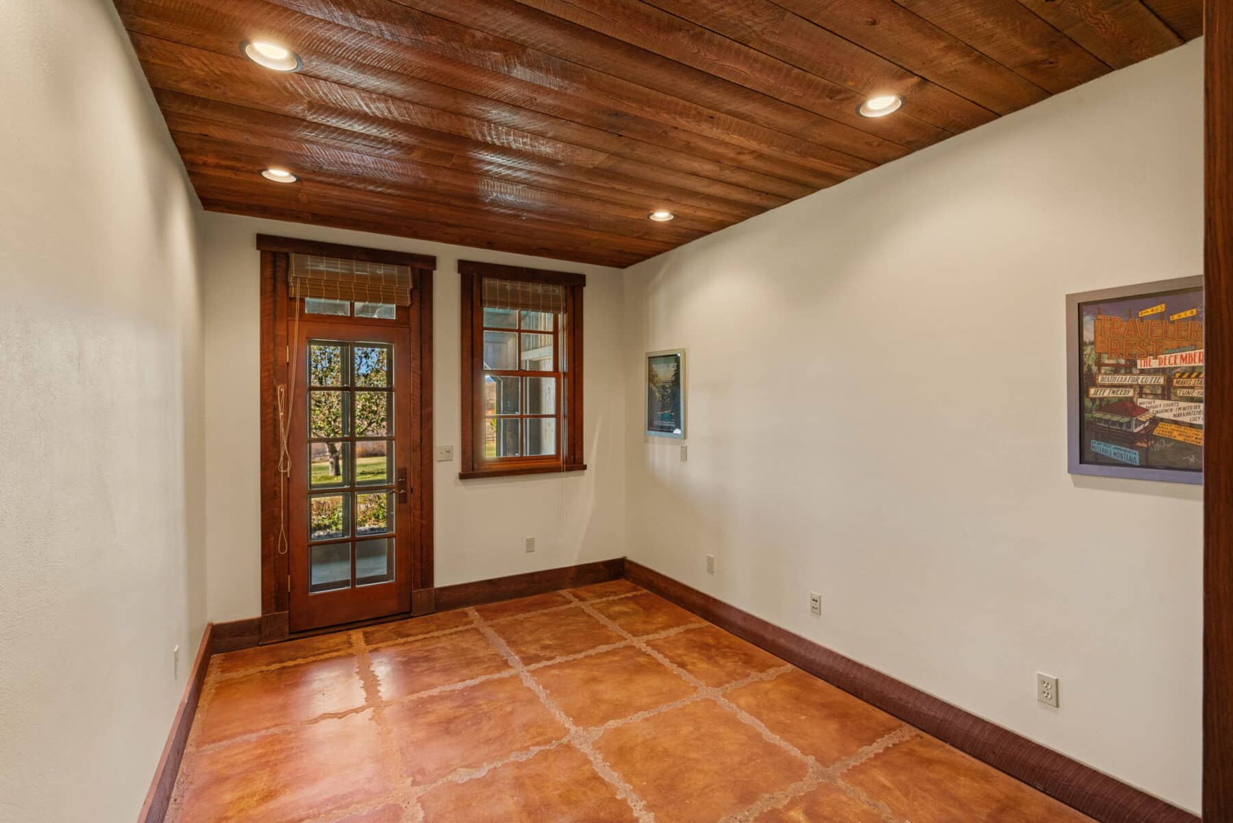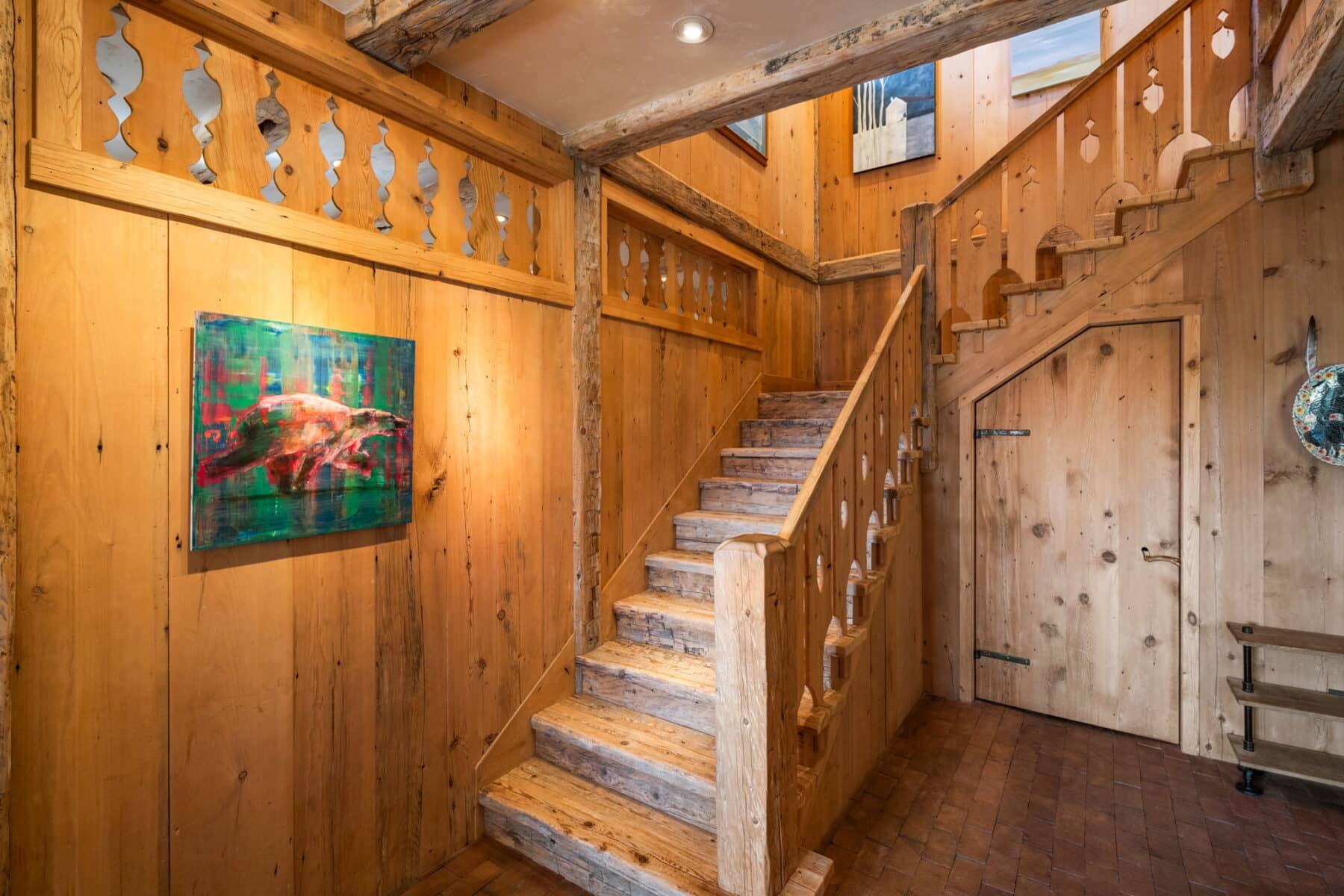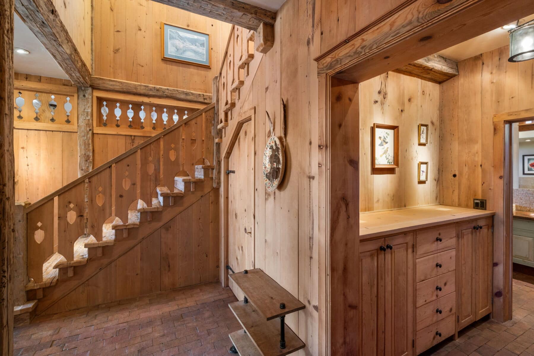 The detached garage, added in 2004, complements the Montana compound with its timeless design that appears to have graced the property for centuries. Spanning 1,496 square feet, this sloped “turn-out shed” style structure features an oversized two-car garage with two manual sliding doors beautifully clad in reclaimed timber and one electric overhead door. The exterior showcases a harmonious blend of dry-stacked regional stone and weathered timbers, while the interior offers practical finishes, including plywood walls and concrete flooring. Beyond its primary function, the building houses dedicated spaces for storage, a wine cellar, and a potting shed. Thoughtful amenities include in-floor radiant heating and abundant wood-clad windows that flood the space with natural light. A custom door provides additional access to the garage, making this outbuilding both functional and architecturally striking.