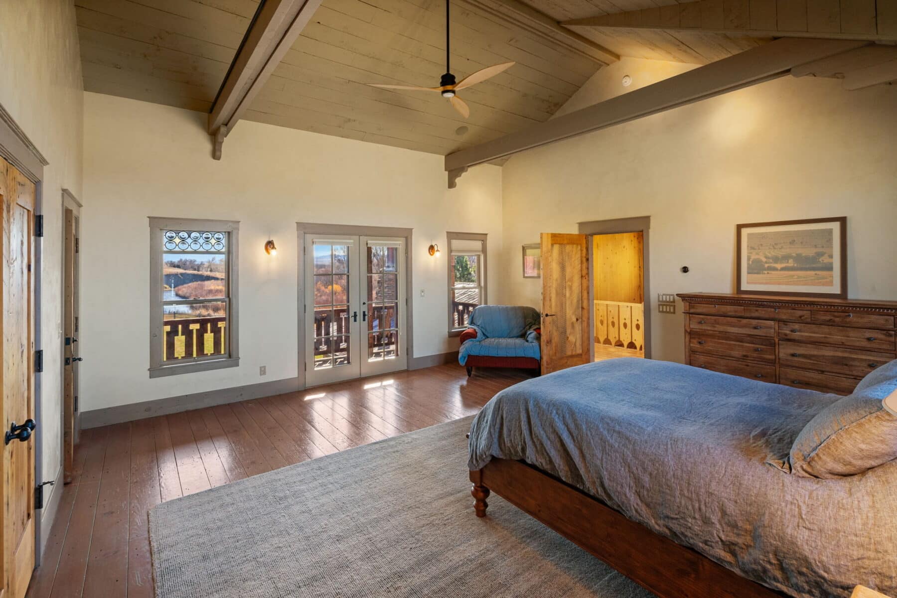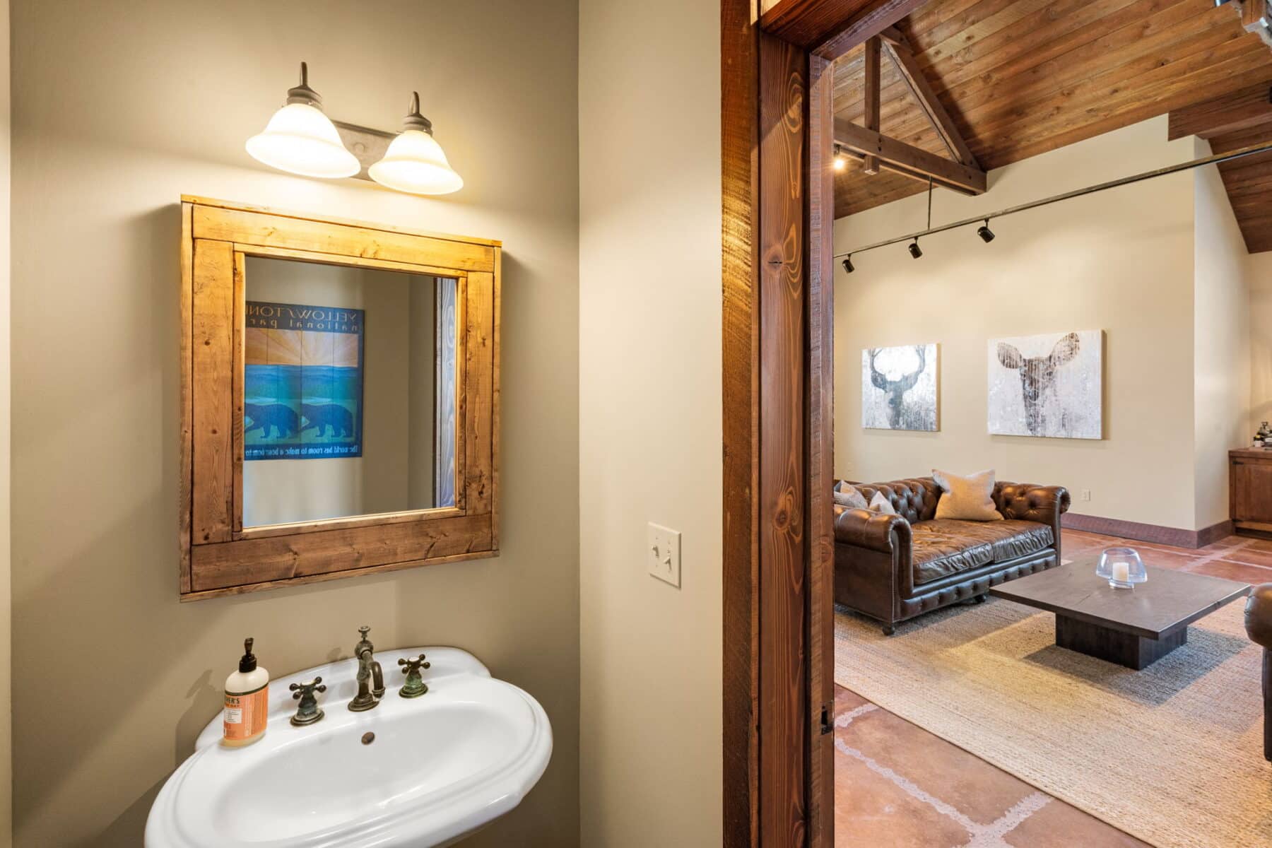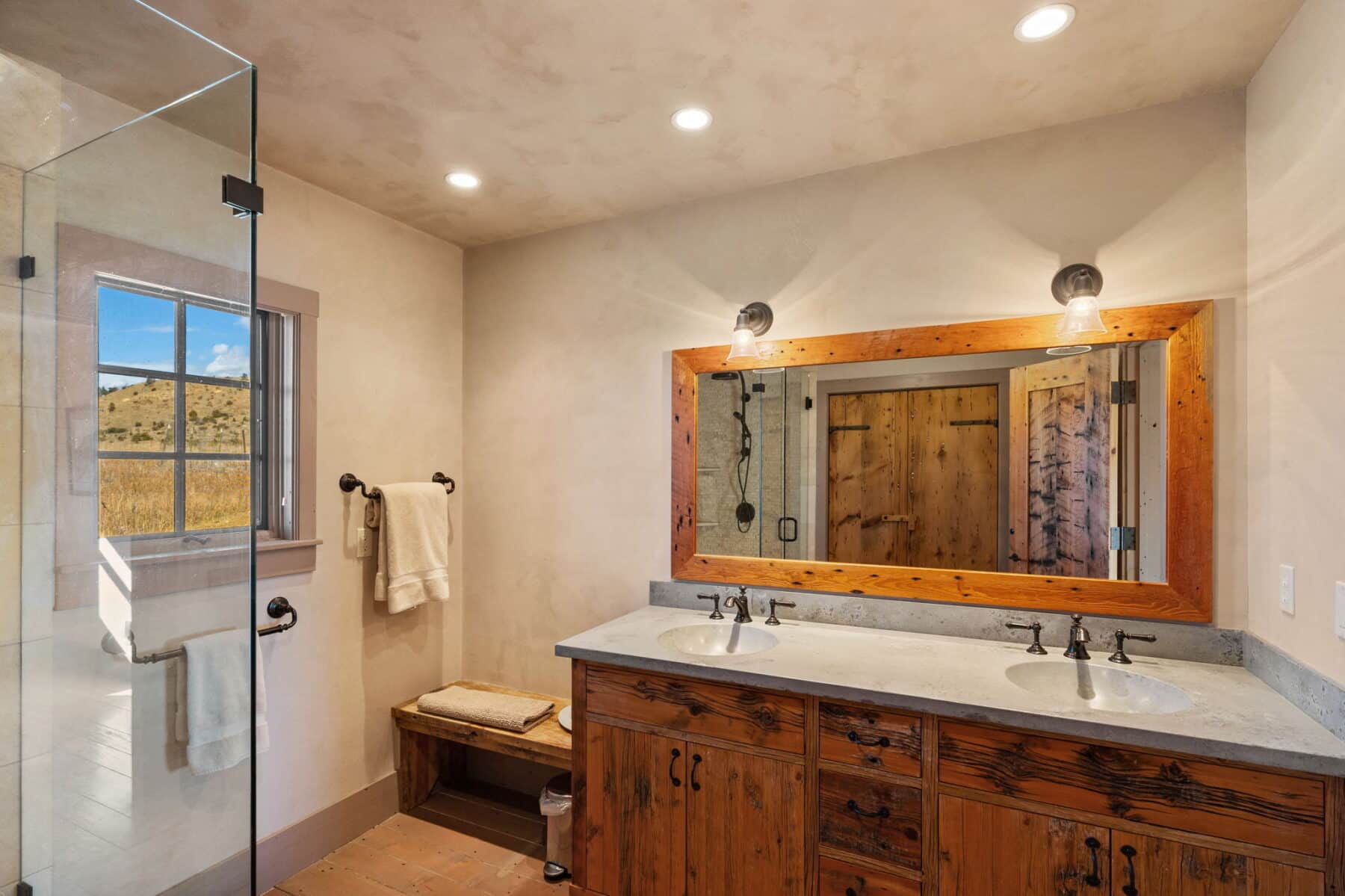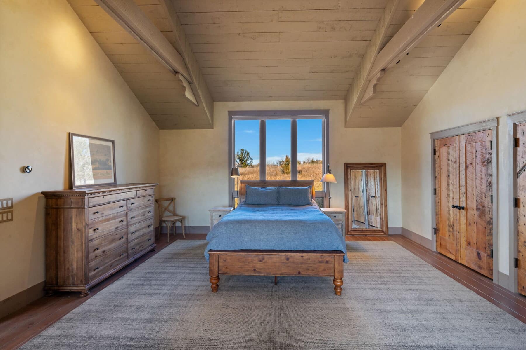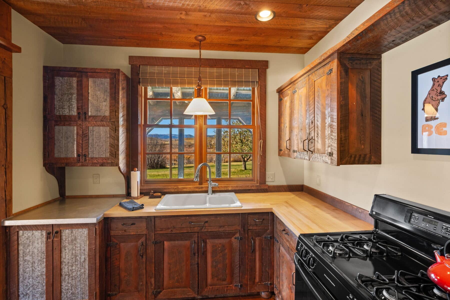 Also designed by architect Larry Pearson and brought to life by Yellowstone Traditions in 1999, this 2,905-square-foot two-bedroom guest house is reminiscent of a traditional barn with its graceful sloping lines and generous overhangs. The guest house seamlessly integrates into its natural surroundings, offering stunning views of the river and mountains. Built with authenticity using reclaimed materials from 19th and 20th-century regional buildings, the home features a reclaimed corrugated steel roof and acid-stained concrete floors throughout, all warmed by radiant in-floor heating. The heart of the space is a grand, light-filled great room with soaring cathedral timber and beam-clad ceilings, complemented by strategically placed Pella windows and skylights. The thoughtful floor plan includes a farm-style galley kitchen with butcher block and steel countertops, a comfortable living/dining area, and a versatile extra room featuring built-in amenities. A screened 388-square-foot porch and a stone patio, complete with a fire pit and boulder benches provide an outdoor living space. Modern comforts include a three-quarter bath with copper fixtures and a powder room. Throughout the guest house, custom cabinetry, artisanal details, and multiple outdoor access points create a space that functions beautifully as a luxurious guest retreat.