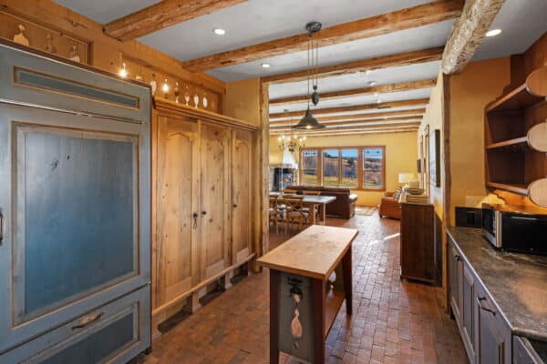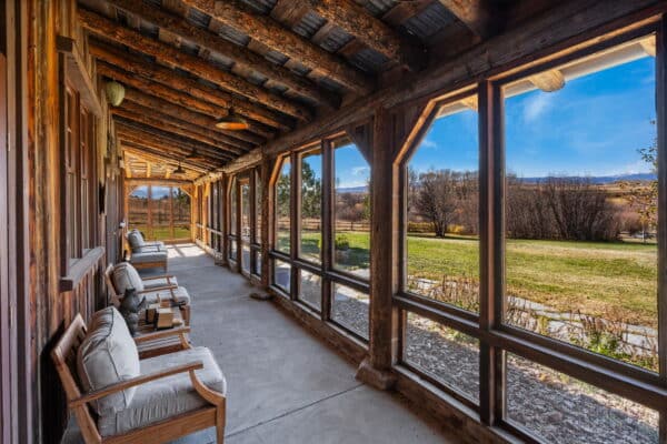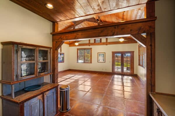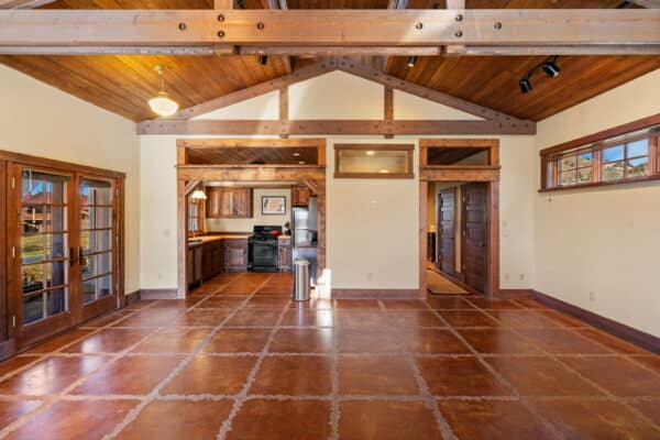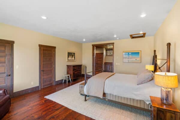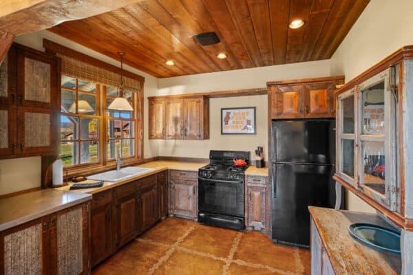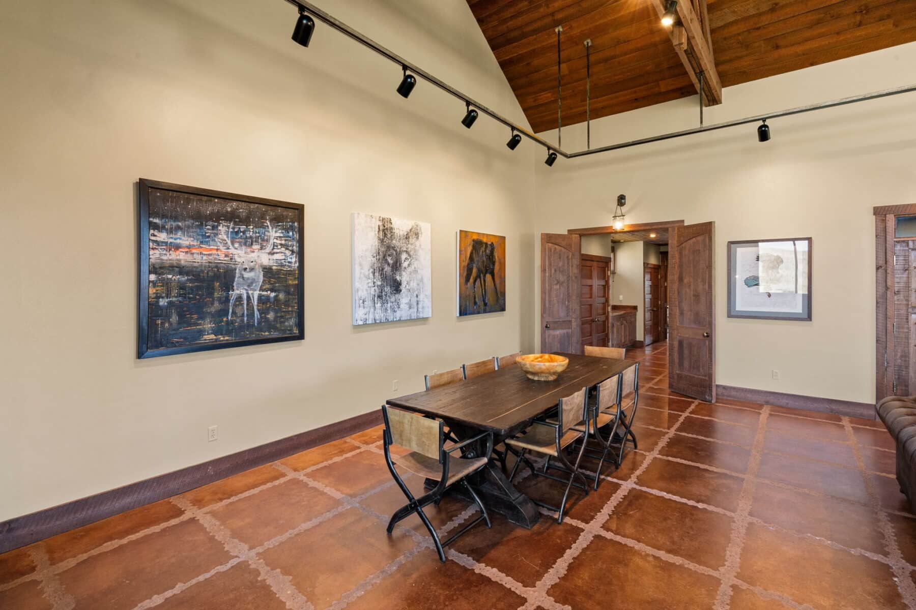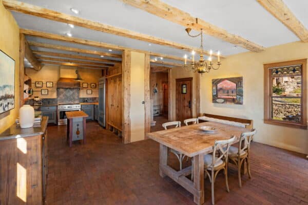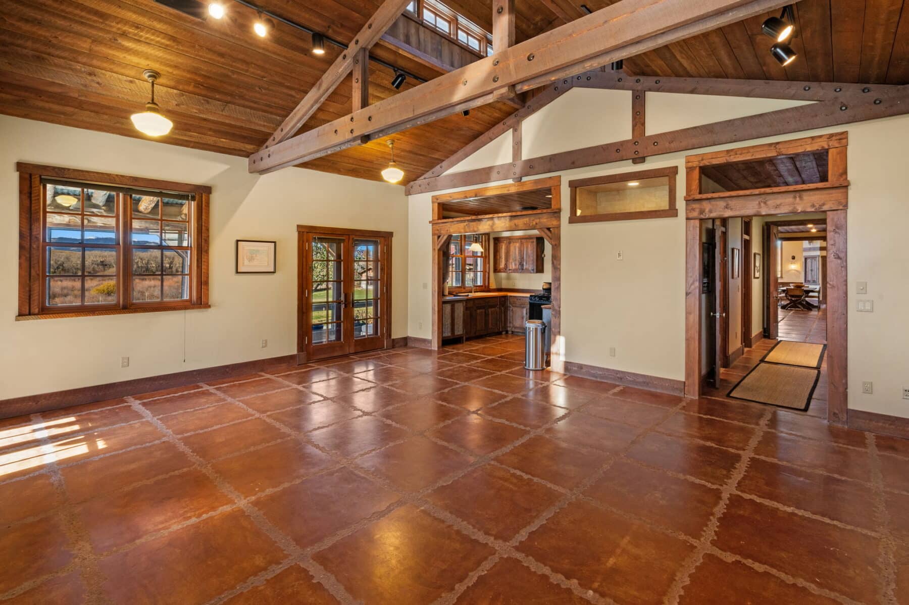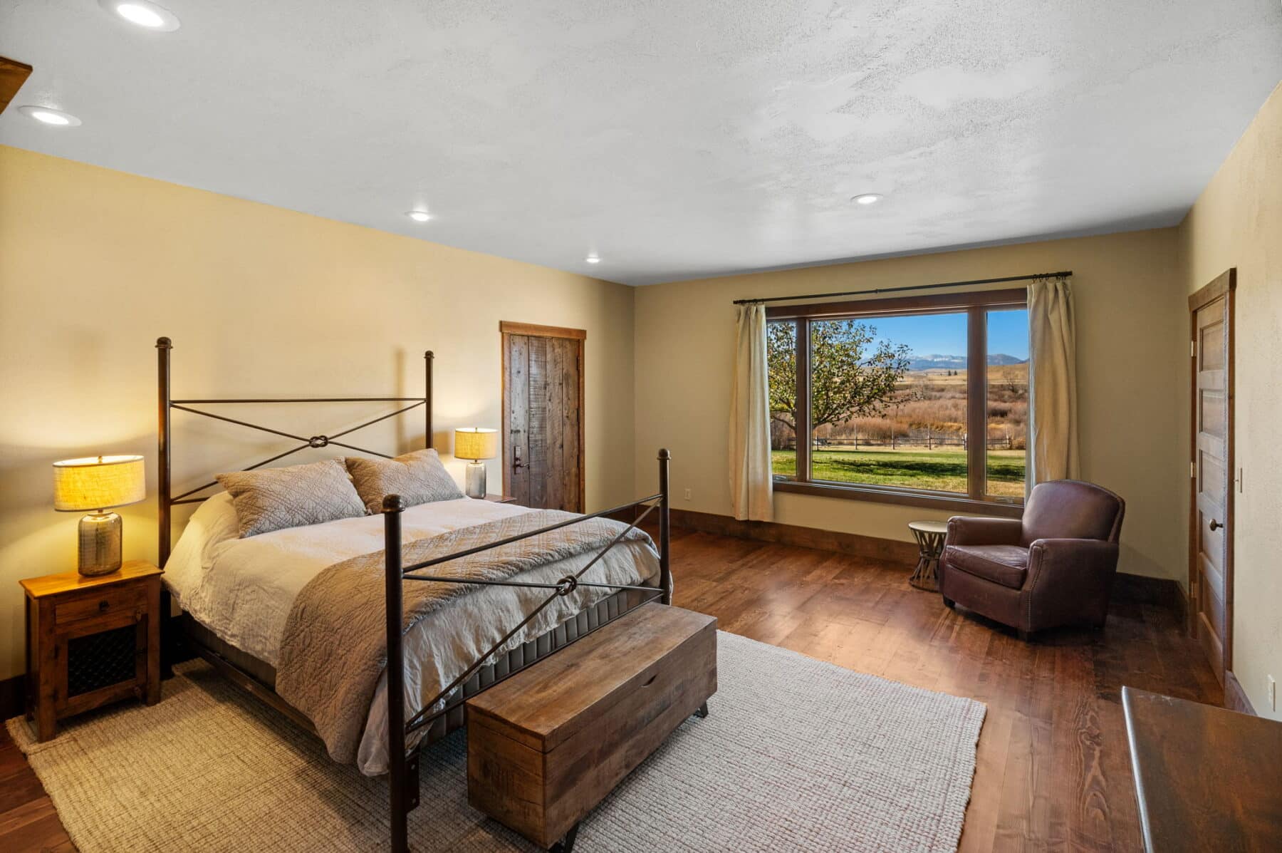 Also designed by architect Larry Pearson and brought to life by Yellowstone Traditions in 1999, this 2,905-square-foot two-bedroom guest house is reminiscent of a traditional barn with its graceful sloping lines and generous overhangs. The guest house seamlessly integrates into its natural surroundings, offering stunning views of the river and mountains. Built with authenticity using reclaimed materials from 19th and 20th-century regional buildings, the home features a reclaimed corrugated steel roof and acid-stained concrete floors throughout, all warmed by radiant in-floor heating. The heart of the space is a grand, light-filled great room with soaring cathedral timber and beam-clad ceilings, complemented by strategically placed Pella windows and skylights. The thoughtful floor plan includes a farm-style galley kitchen with butcher block and steel countertops, a comfortable living/dining area, and a versatile extra room featuring built-in amenities. A screened 388-square-foot porch and a stone patio, complete with a fire pit and boulder benches provide an outdoor living space. Modern comforts include a three-quarter bath with copper fixtures and a powder room. Throughout the guest house, custom cabinetry, artisanal details, and multiple outdoor access points create a space that functions beautifully as a luxurious guest retreat.