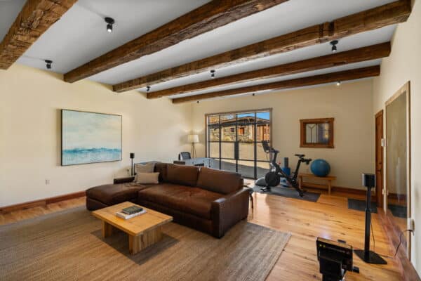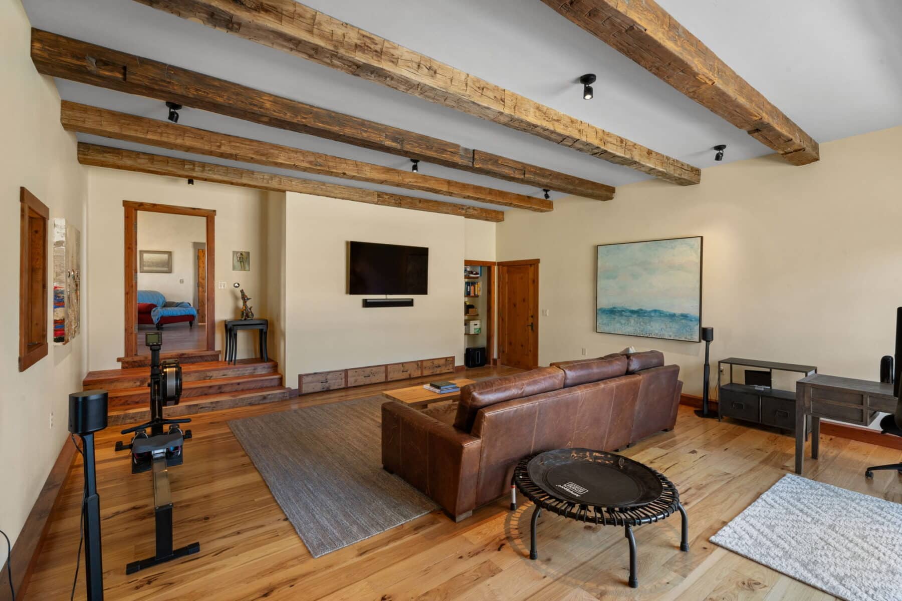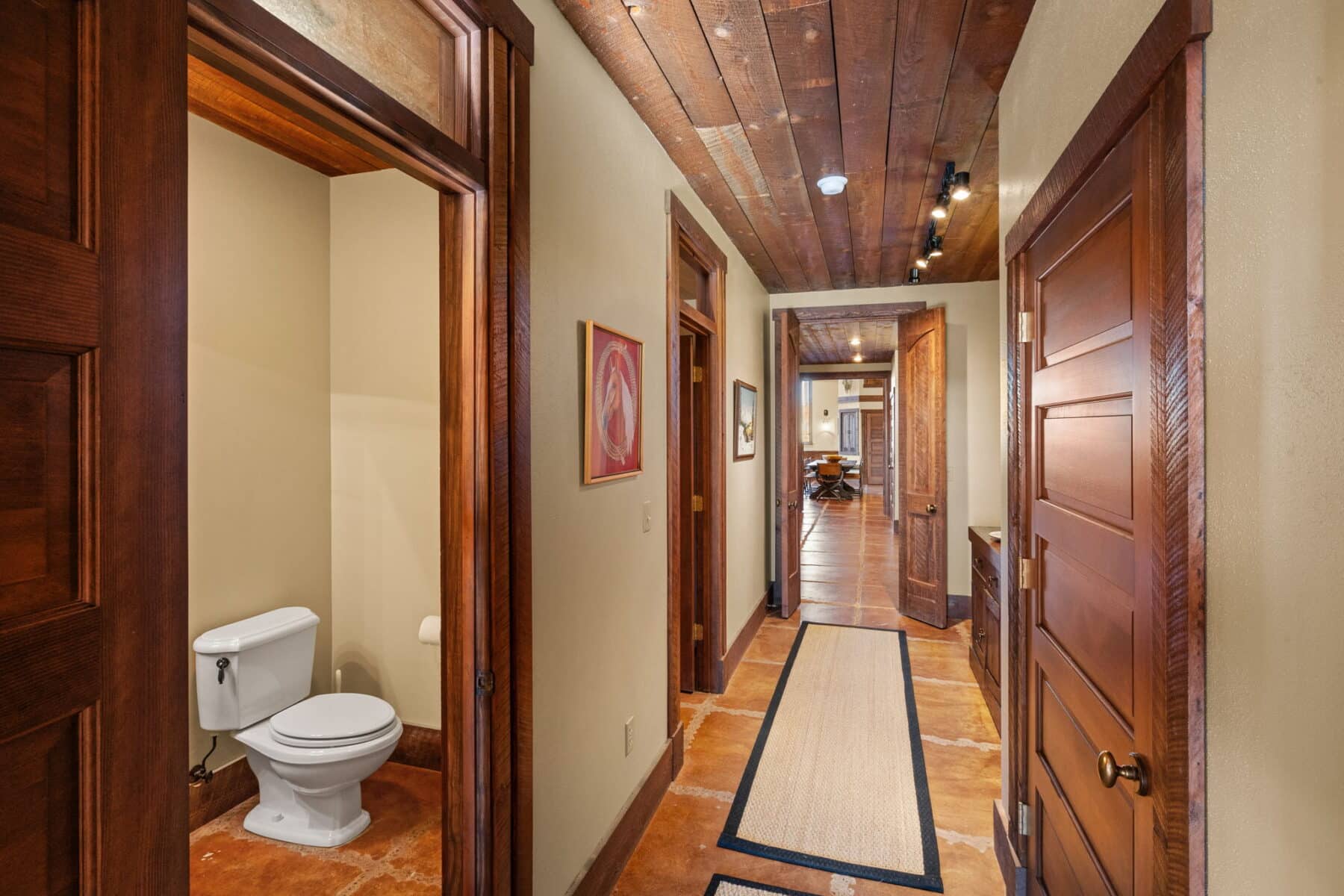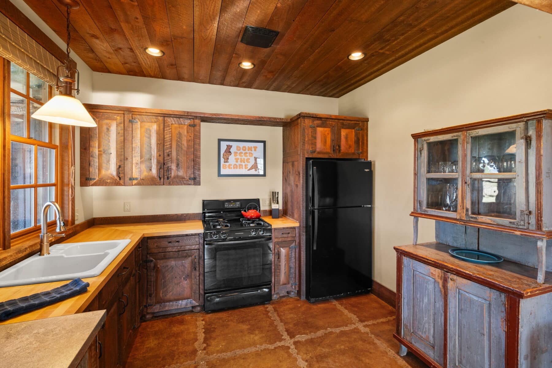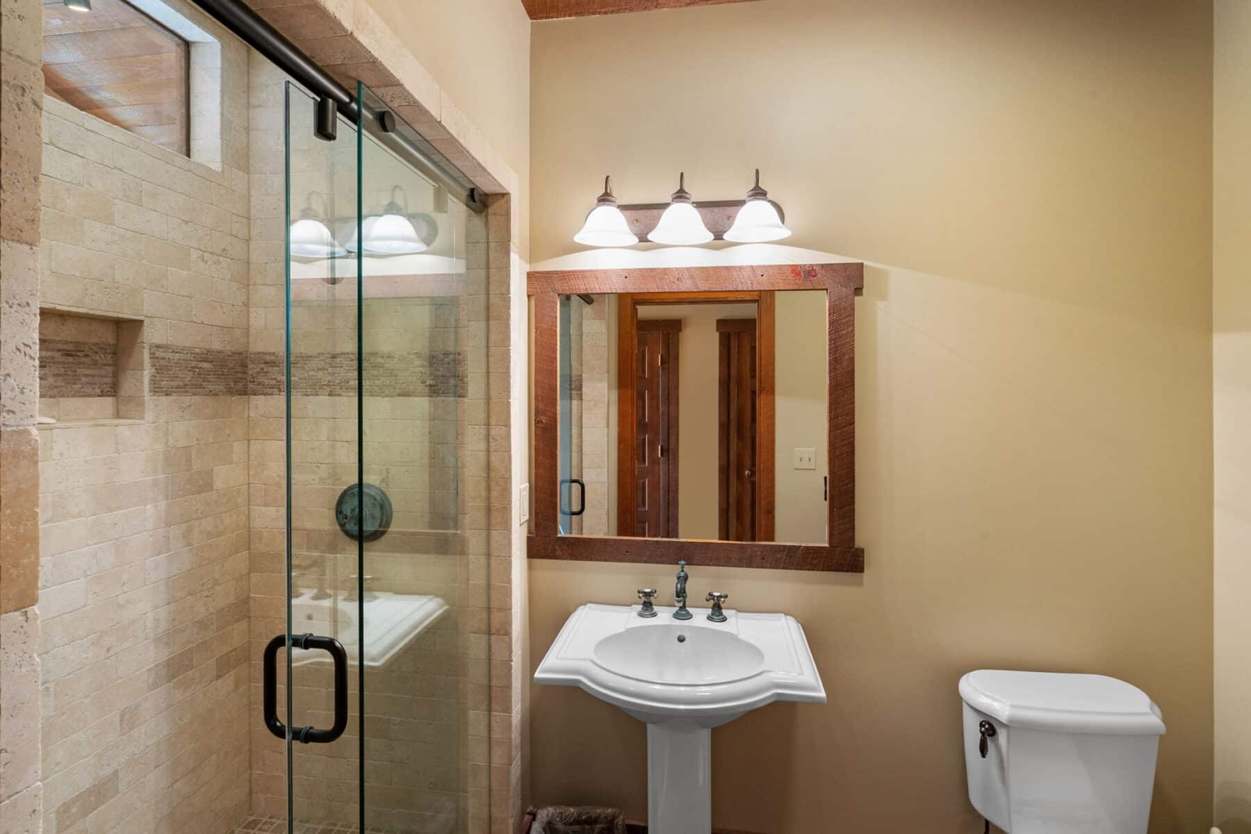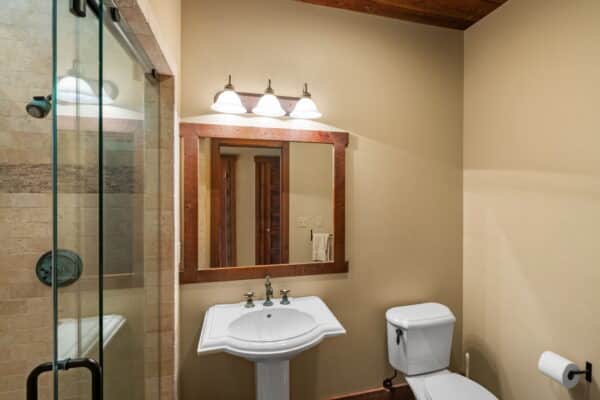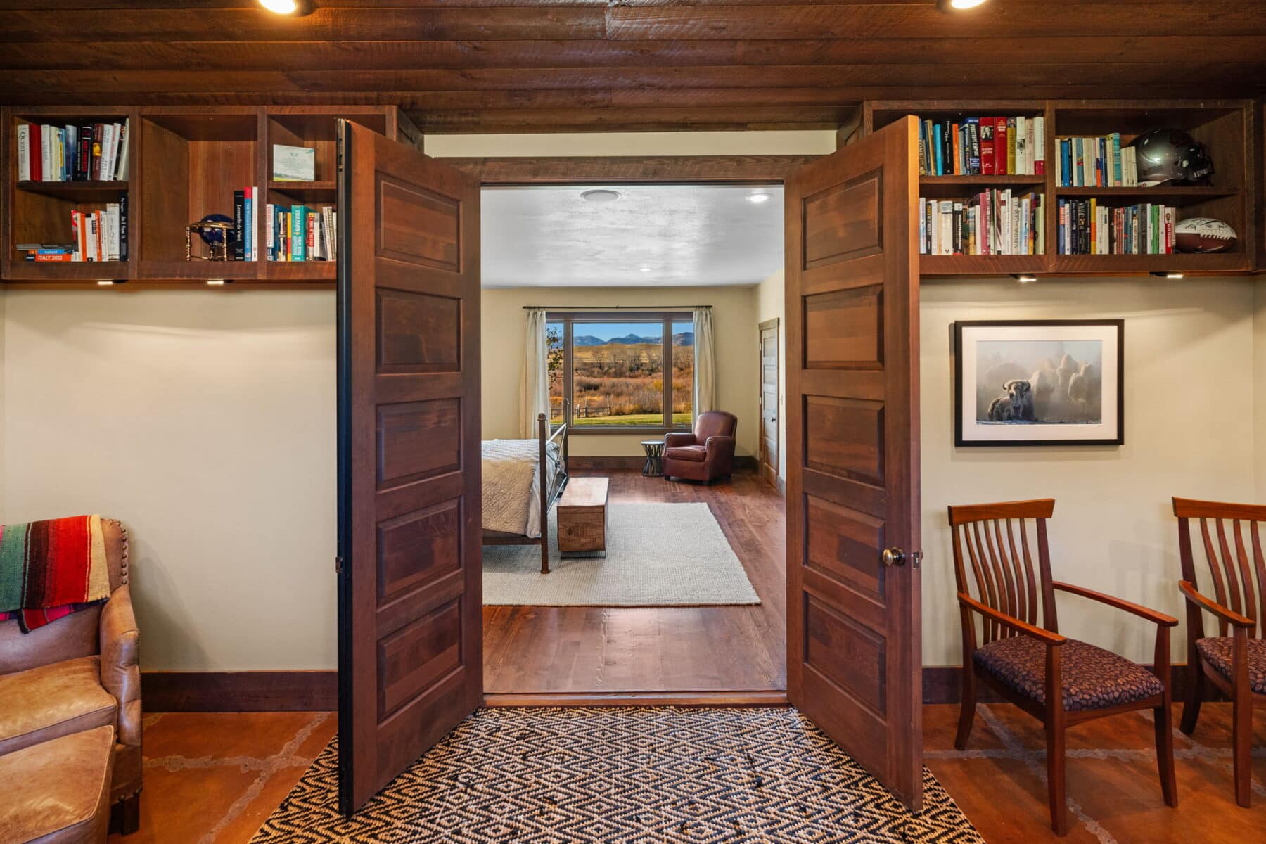 Also designed by architect Larry Pearson and brought to life by Yellowstone Traditions in 1999, this 2,905-square-foot two-bedroom guest house is reminiscent of a traditional barn with its graceful sloping lines and generous overhangs. The guest house seamlessly integrates into its natural surroundings, offering stunning views of the river and mountains. Built with authenticity using reclaimed materials from 19th and 20th-century regional buildings, the home features a reclaimed corrugated steel roof and acid-stained concrete floors throughout, all warmed by radiant in-floor heating. The heart of the space is a grand, light-filled great room with soaring cathedral timber and beam-clad ceilings, complemented by strategically placed Pella windows and skylights. The thoughtful floor plan includes a farm-style galley kitchen with butcher block and steel countertops, a comfortable living/dining area, and a versatile extra room featuring built-in amenities. A screened 388-square-foot porch and a stone patio, complete with a fire pit and boulder benches provide an outdoor living space. Modern comforts include a three-quarter bath with copper fixtures and a powder room. Throughout the guest house, custom cabinetry, artisanal details, and multiple outdoor access points create a space that functions beautifully as a luxurious guest retreat.