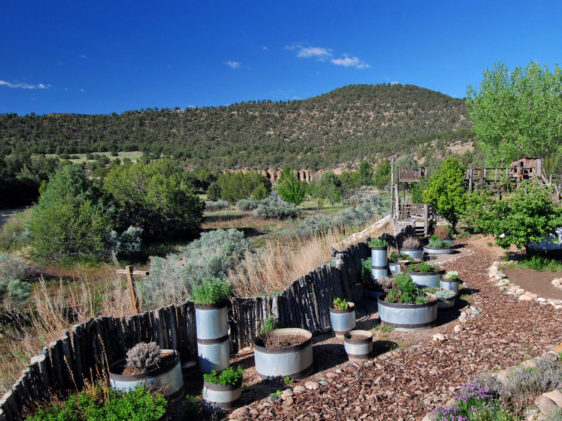 A domestic well near the Log House feeds five ten-thousand gallon storage tanks which in turn gravity feed the Log House and garden area.