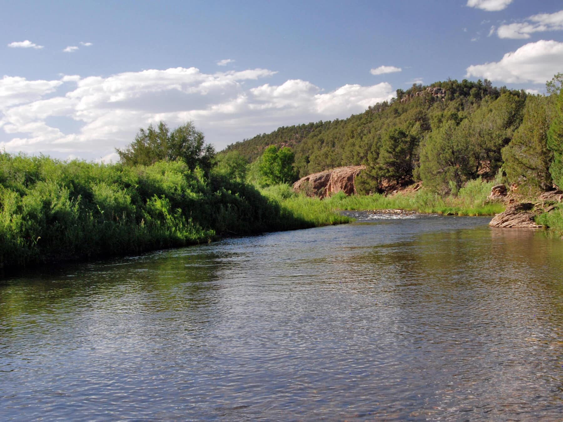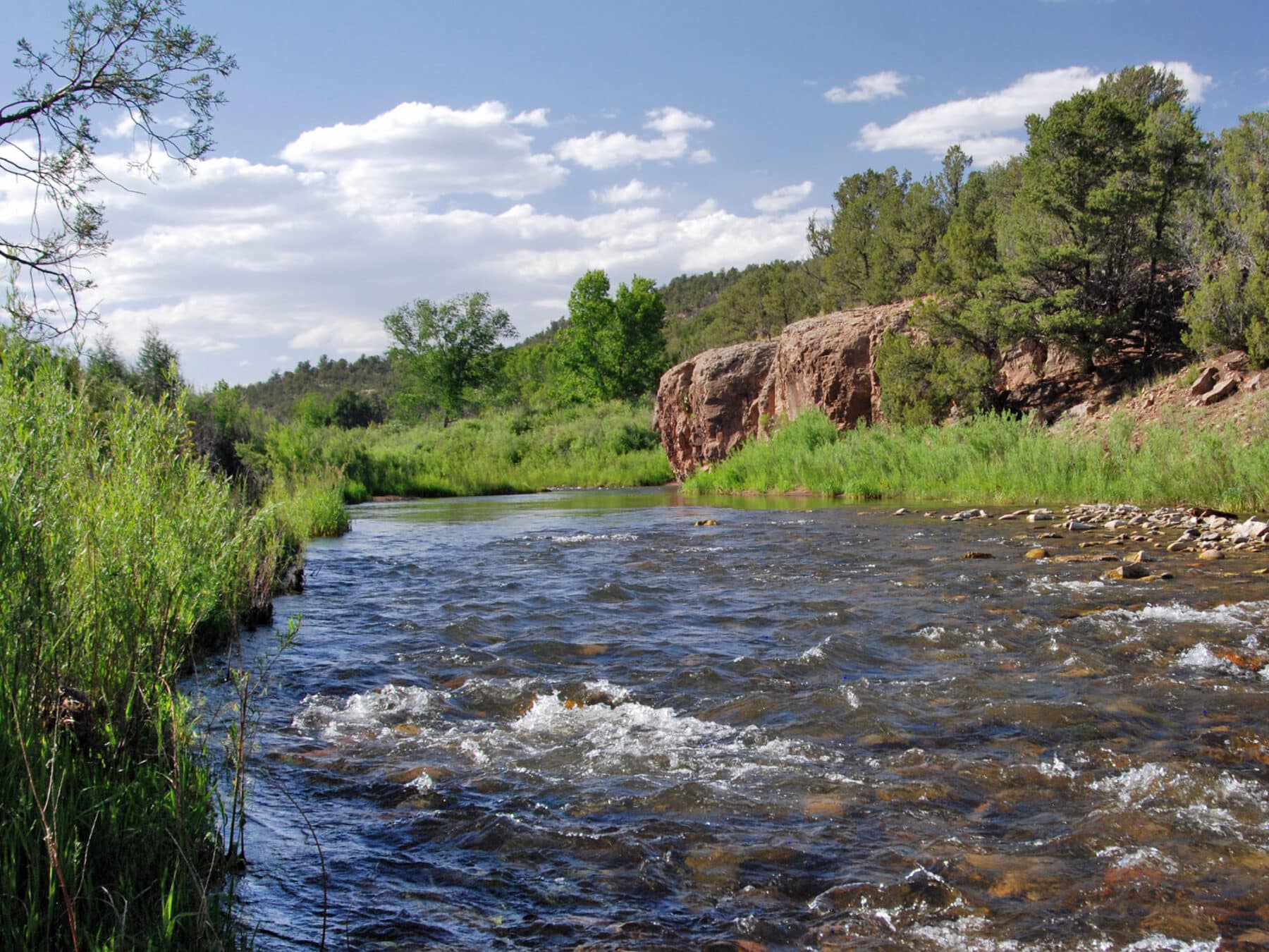 Since purchasing the Ranch in 2000, Fonda has continuously enhanced the Pecos River. Substantial stream restoration has been integrated to improve trout habitat. Five Rivers Inc., based in Bozeman, Montana, methodically designed and implemented the river enhancement work throughout the oxbows and bends of the three-and-a-half miles of the Pecos River that run through the Ranch. The construction of pools and riffles, boulder placement, stream-bank restoration, and the astute placement of fish feeders have created an idyllic habitat for native and stocked rainbow and brown trout. In addition to Fonda, neighbors to the north and south of Forked Lightning Ranch have also actively managed the Pecos River fishery, restocking the River on an annual basis in an effort to bring the fishery back to its historical quality. The 3.5-mile stretch of Pecos River that runs through the Ranch offers some of the finest trout fishing in the state of New Mexico.