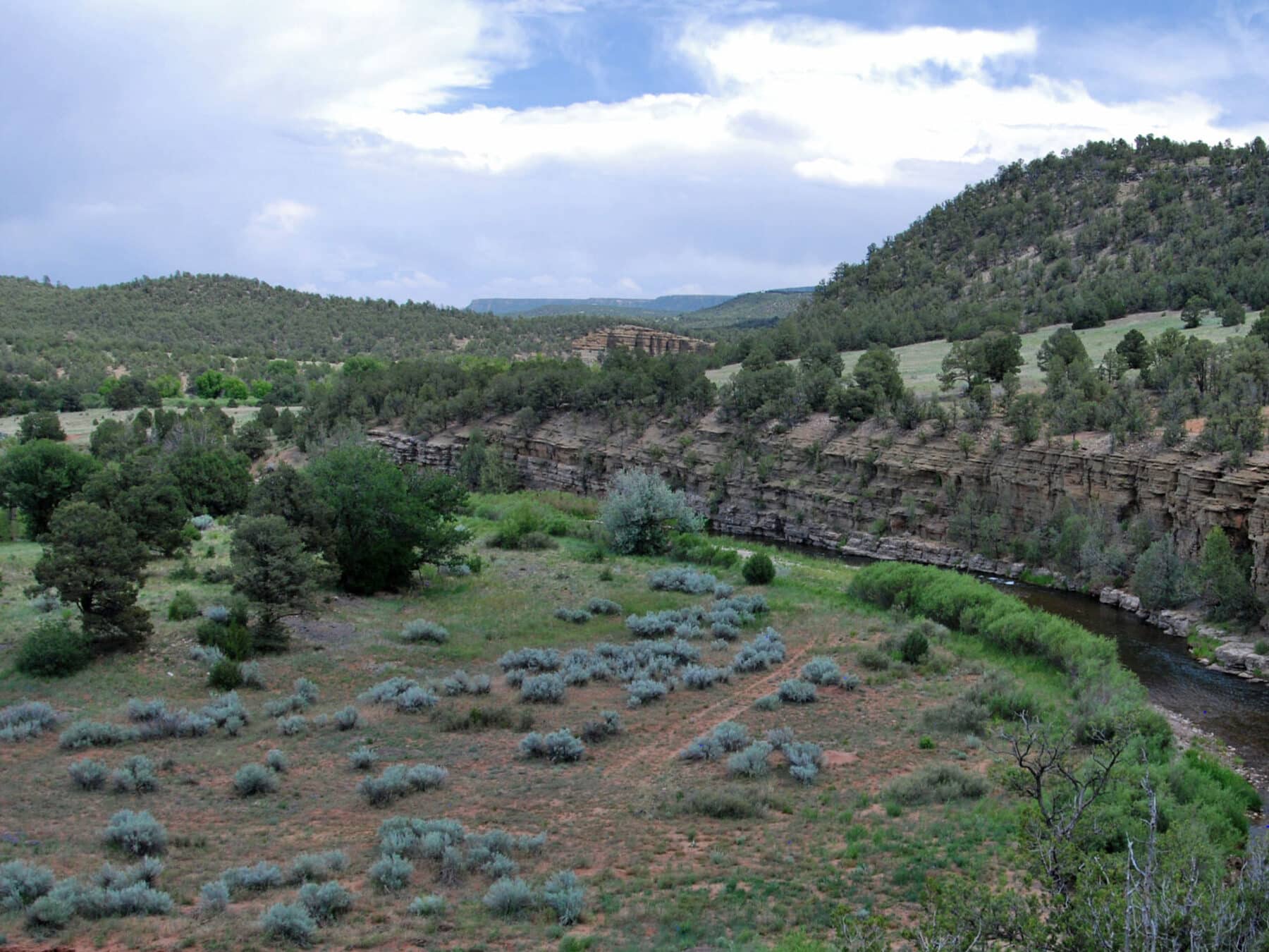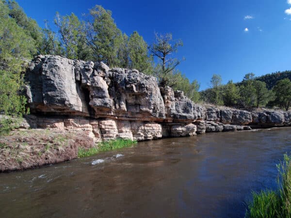 The erosion-resistant anticlinal fold which created the Tecolote Range forced the Pecos River south to the path of least resistance into the soft shale and sandstones of the Glorieta Mesa exposing dramatic red and maroon sedimentary rock cliffs along its banks. The headwaters of the Pecos River originate in the Sangre de Cristo Mountains approximately one hundred miles northwest of the Ranch fed by a multitude of glacial lakes and over ten tributary creeks. From its headwaters, the Pecos flows for approximately 926 miles southeast to join the Rio Grande River near Del Rio, Texas.