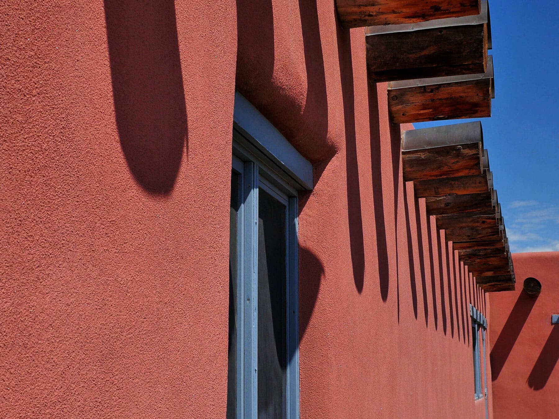 “Fonda was interested in re-creating the look of traditional northern New Mexico dwellings – typically rambling ranch homes that have been added on to over the years. River House was given many of the region’s classic architectural features, among them double adobe walls, a pitched tin roof, and a hand-troweled plaster exterior in a sunbaked terra-cotta color. Reclaimed-wood beams were painstakingly collected for the ceilings, while antique doors were procured from dealers in and around Santa Fe. Fireplaces were built from designs found in a seminal book on New Mexican hearths, and bricks in a range of sunset hues were laid down as flooring, another local hallmark.”–Architectural Digest, March 2014, Pages 146-148.
