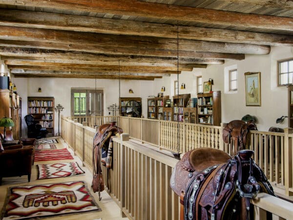 Upon entering River House, the expansive foyer, with bedrooms positioned on either side, opens up to the second floor exhibiting Fonda’s personal library. Inspired by Santa Fe’s Public Library, Fonda’s galleria on the second floor contains thousands of books acquired over decades of gifts and collecting inspirational readings.