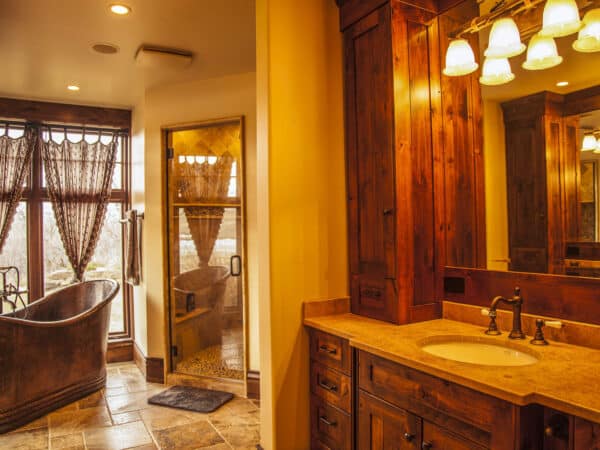 The master bedroom features a gas fireplace with natural stone and a custom-upholstered window seat to enjoy the commanding river views. The master bath has a fully-tiled shower with a European glass door, a luxurious hammered copper soaking tub, and a walk-in closet complete with custom shelving and drawers.